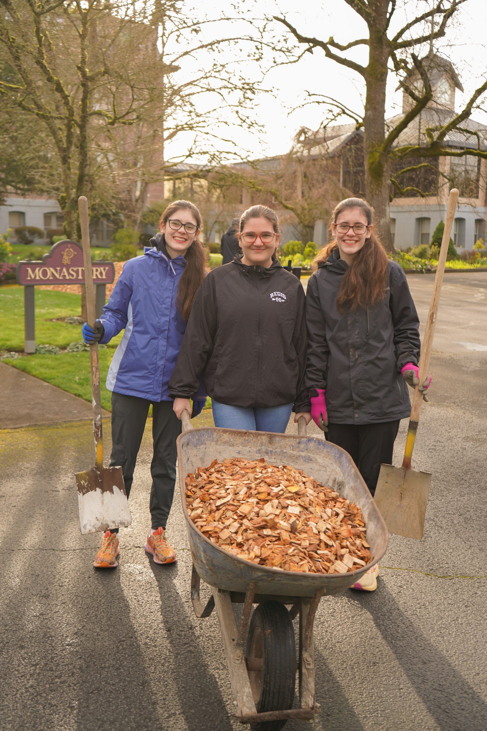 Regis High School students spent the day at Queen of Angels Monastery, beginning with morning prayer in the chapel. Students and staff tended the grounds by spreading bark chips and pulling weeds, stocked shelves at Mission Benedict, and visited some of our Adult Residential homes.