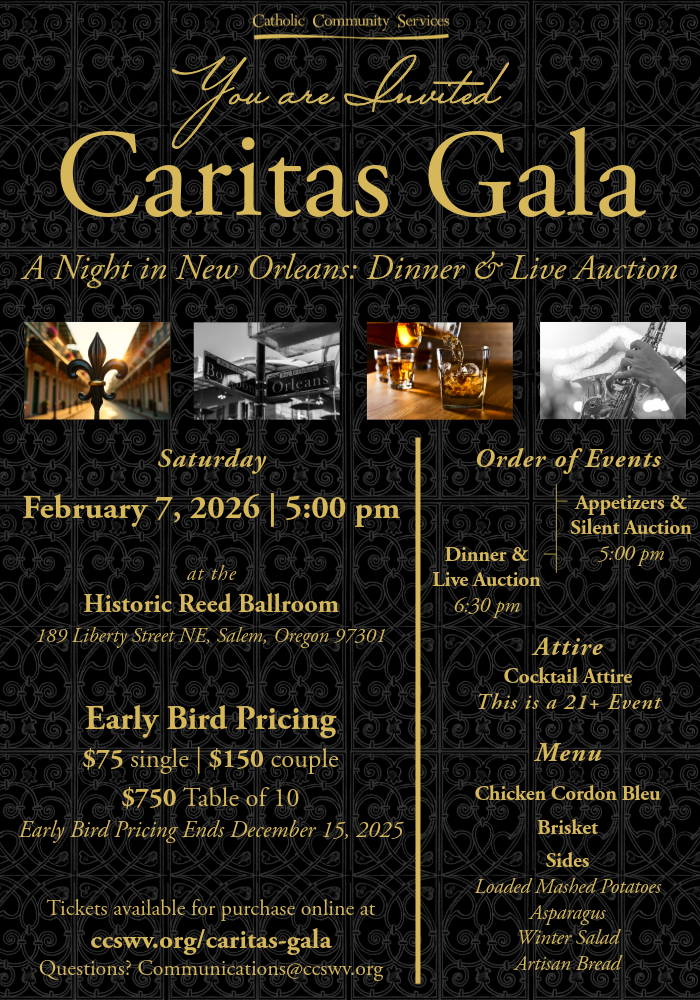 Join us for our new signature fundraising event, the Caritas Gala: A Night in New Orleans. Caritas, the Latin word for charity and love of humankind, reflects the mission of Catholic Community Services.